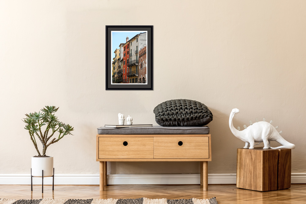 The spirit of Verona, Italy is portrayed on its streets full of different warm colors and textures. Photographer and Digital Artist, Scott Allen Wilson, shows a street with an architectural style that is traditional to this city. The warm colors of the image can dress up any wall and give it a homely touch. The print has been realized on Hahnemühle FineArt Pearl paper and mounted with an anthracite passe-partout. It is displayed underneath a matte float glass and surrounded by a beautiful ebony solid wood frame. Every element of this piece was individually selected with the intention of being a part of a unified piece of art.