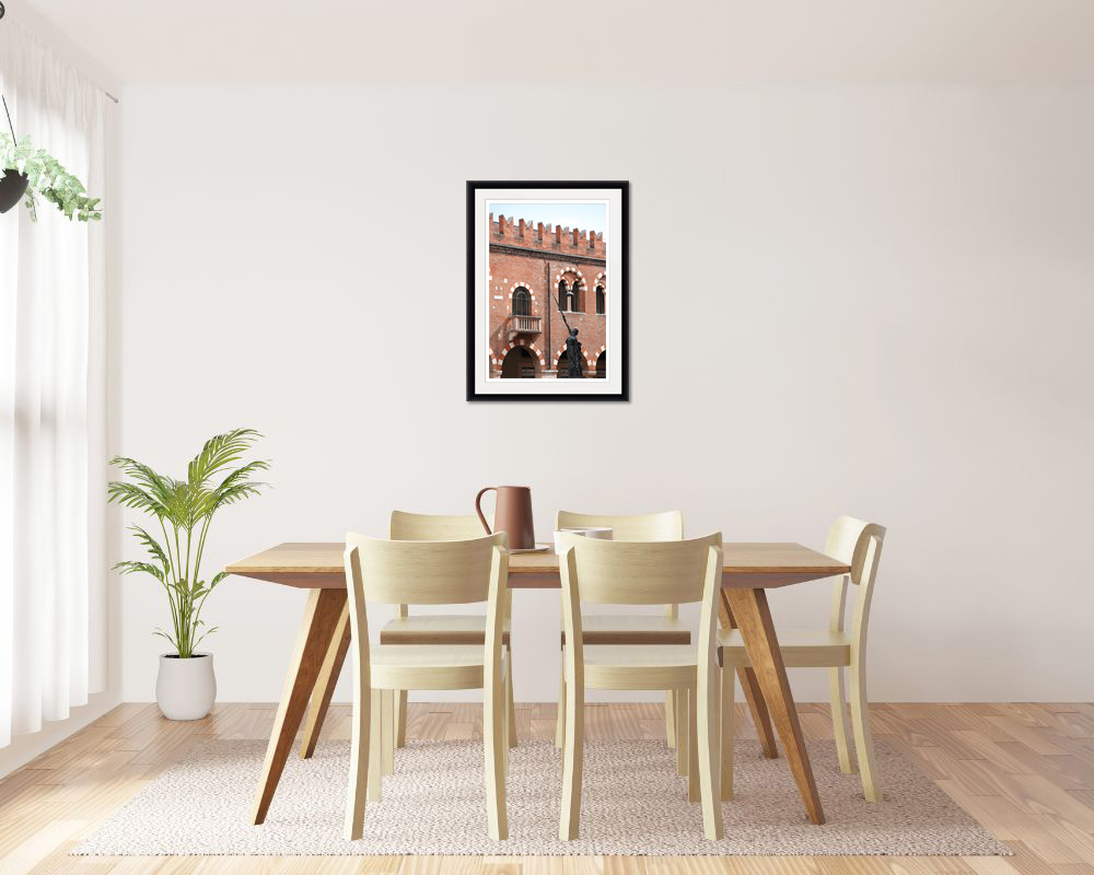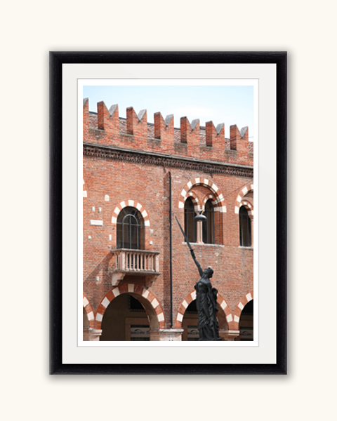 In front of the walls of Palazzo della Ragione stands a statue of a woman holding a sword pointing right at the center of the image. The brick structure occupies most of the photo’s space, making it perfect to combine with earthy colors and warm decoration. This print was taken in Veronal, Italy by Photographer and Digital Artist, Scott Allen Wilson. It has been realized on Hahnemühle FineArt Pearl paper and mounted with a natural white passe-partout. The mounted print is displayed underneath a matte float glass and surrounded by a beautiful ebony solid wood frame. Every element of this piece was individually selected with the intention of being part of a unified piece of art.