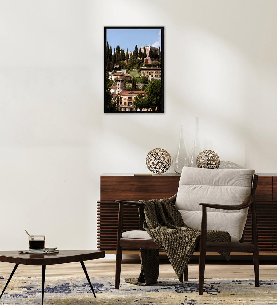 This beautiful landscape view of Verona, Italy was taken by Photographer and Digital Artist, Scott Allen Wilson. These hills are filled with vibrant green trees and traditional architecture transmits a calming and harmonic sensation. This print can give a lot of color to your walls and will transport you to this lovely city every time you see it! It has been realized on glossy Fuji Crystal Archive paper, displayed underneath a matte float glass, and surrounded by a beautiful black oak floater frame. Every element of this piece was individually selected with the intention of being a part of a unified piece of art.