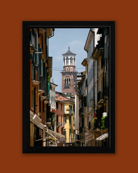 A narrow street in Verona, Italy was taken by Photographer and Digital Artist, Scott Allen Wilson, who guides our view to the clocktower of Palazzo della Regione. The colorful buildings and balconies full of plants and flowers transport you for a moment to the lively environment of the city. This print has been realized on glossy Fuji Crystal Archive paper, displayed underneath a matte float glass, and surrounded by a beautiful black oak floater frame. Every element of this piece was individually selected with the intention of being a part of a unified piece of art.