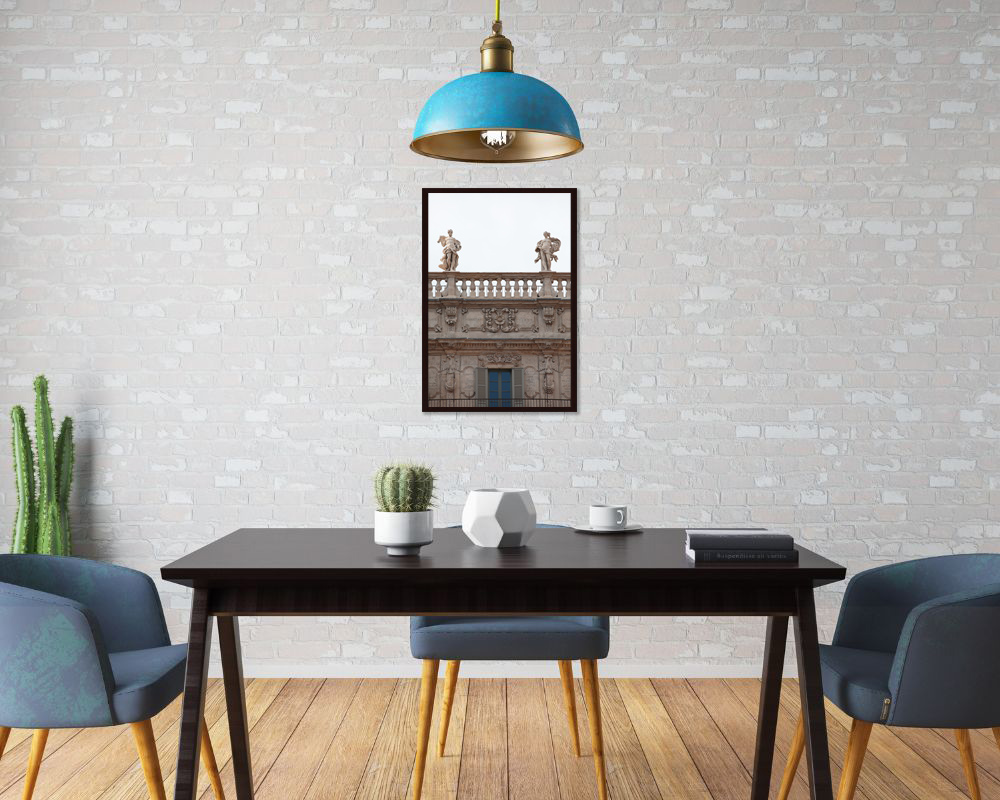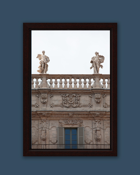 This detailed shot of Palazzo Maffei was taken Verona, Italy by Photographer and Digital Artist, Scott Allen Wilson. The intention of the close view is to show the symmetry and balance of its architecture, as well as the details of the adornments. This print is perfect to give your room an elegant and classical touch. The print has been realized on glossy Fuji Crystal Archive paper and mounted beneath acrylic glass. The mounted print is surrounded by a beautiful dark brown floater frame. Every element of this piece was individually selected with the intention of being a part of a unified piece of art.
