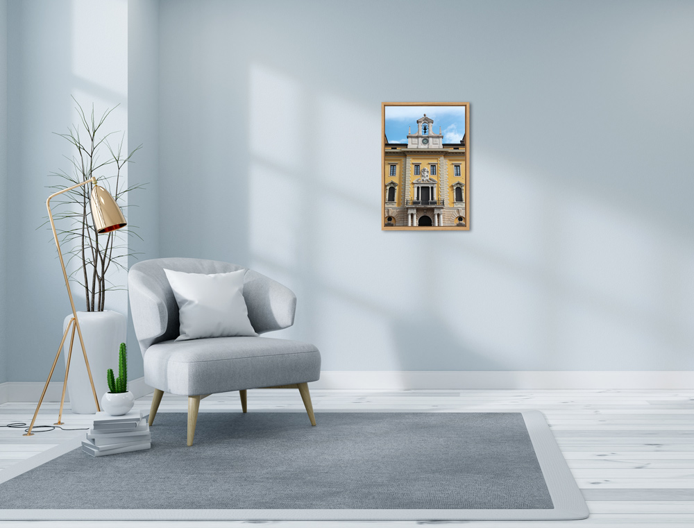 This beautiful yellow masterpiece is located in Verona, Italy, and is the prestigious and iconic Palazzo delle Poste. Photographer Scott Allen Wilson lets us appreciate the beauty of the details and symmetry of this traditional Veronese architecture. Do you have some yellow decorations? Try this print on your wall to boost the environment! The print has been realized on glossy Fuji Crystal Archive paper and mounted beneath acrylic glass. The mounted print is surrounded by a beautiful natural oak floater wood frame. Every element of this piece was individually selected with the intention of being a part of a unified piece of art.