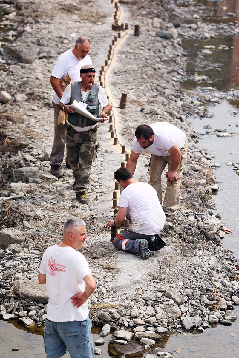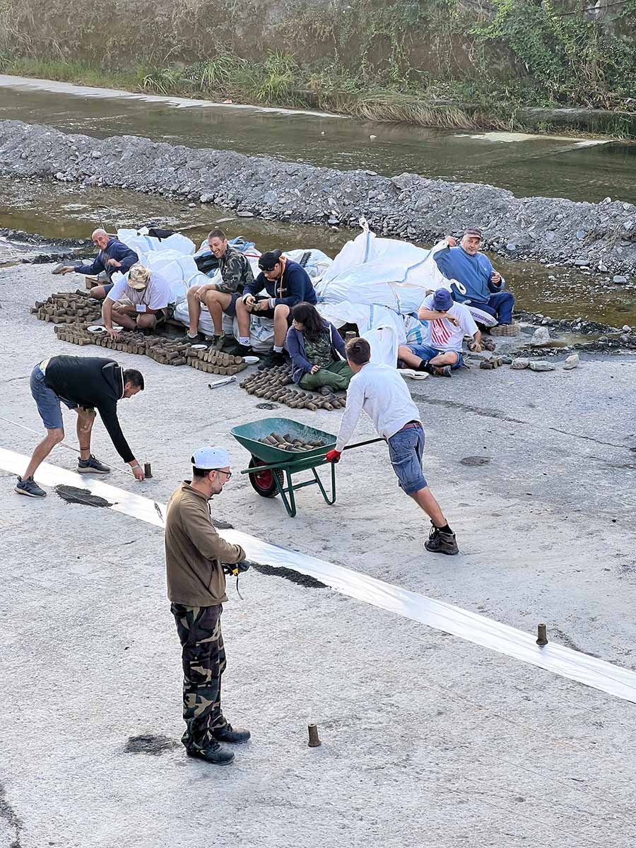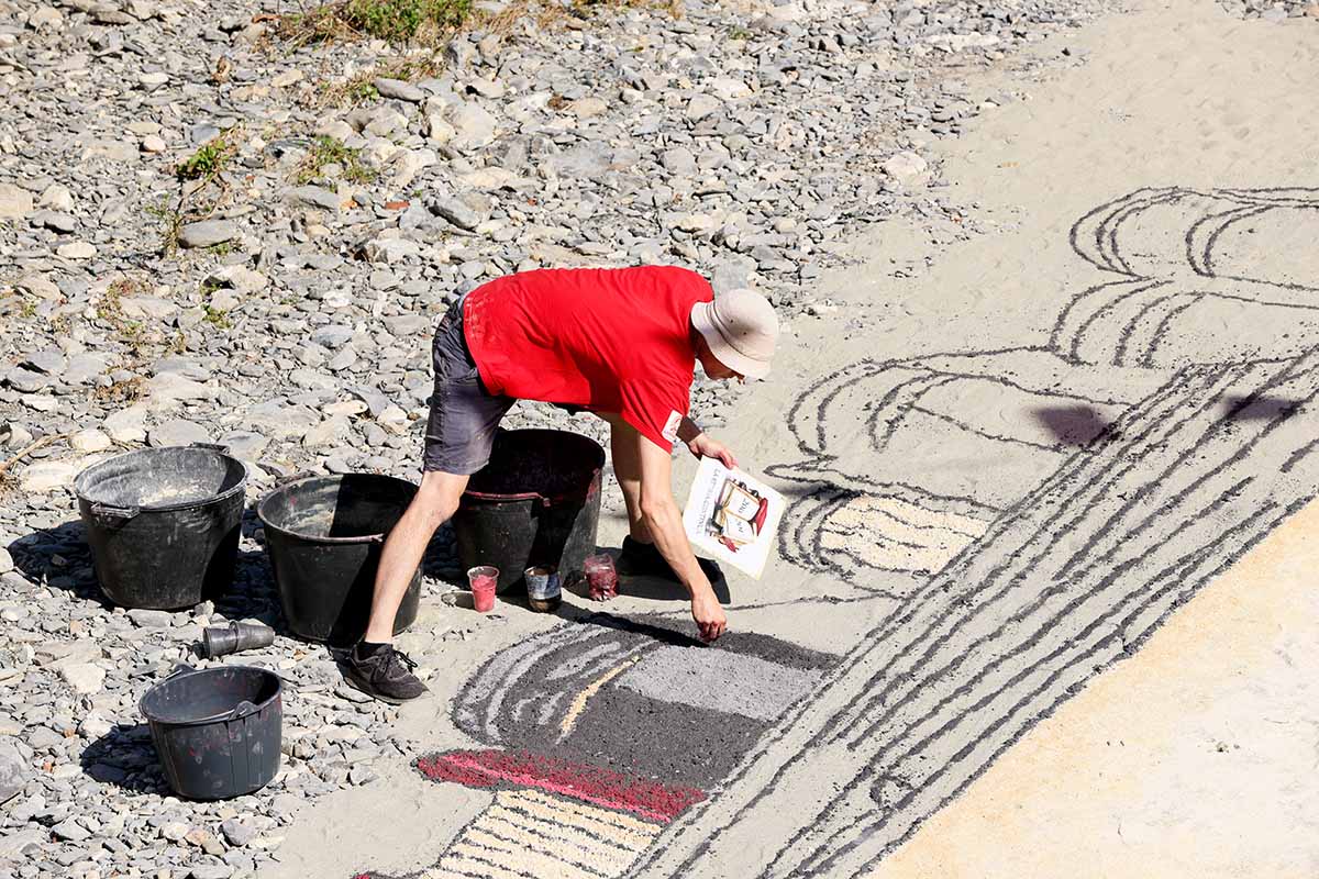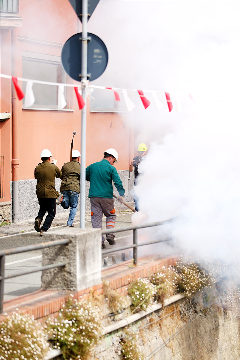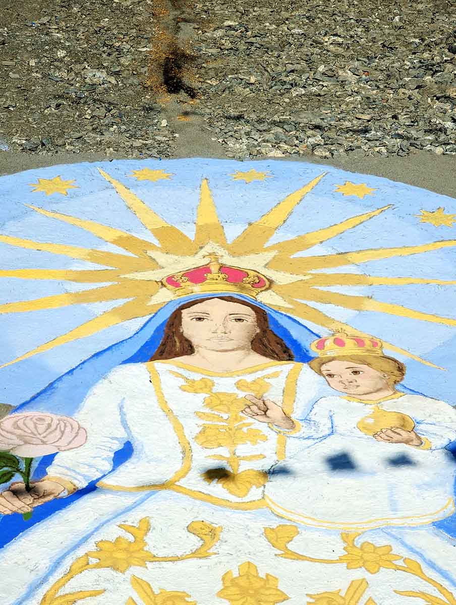 During the day, the mascoli thunder from the dry riverbed, heavy hand-packed mortars that roll through the valley, and you can almost feel them in your body, like a deep shared heartbeat moving through the crowd. Fired in sequence, they mark each stage of the feast: the processions, the flag raisings, the Masses, the Madonna’s passage across the bridge.