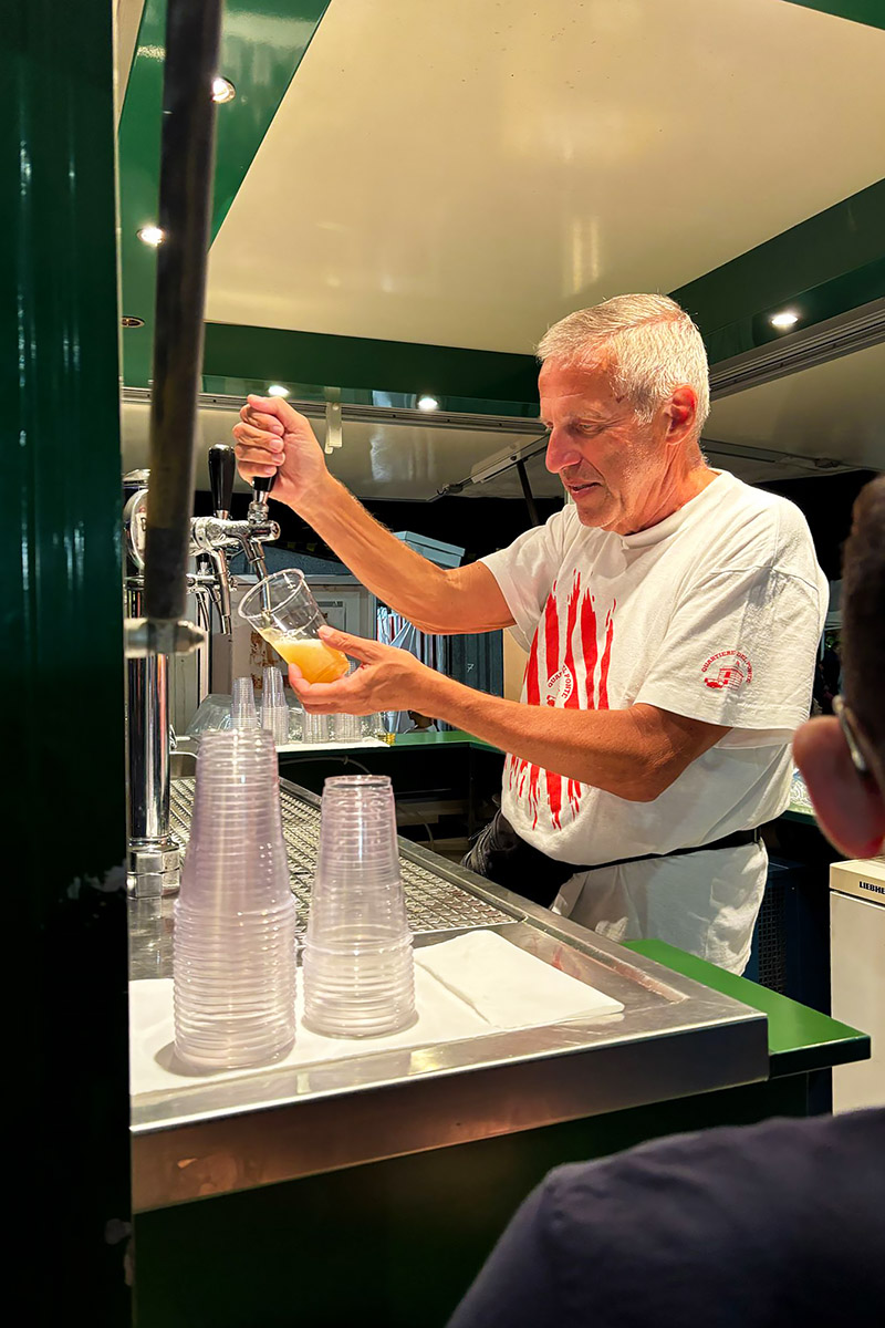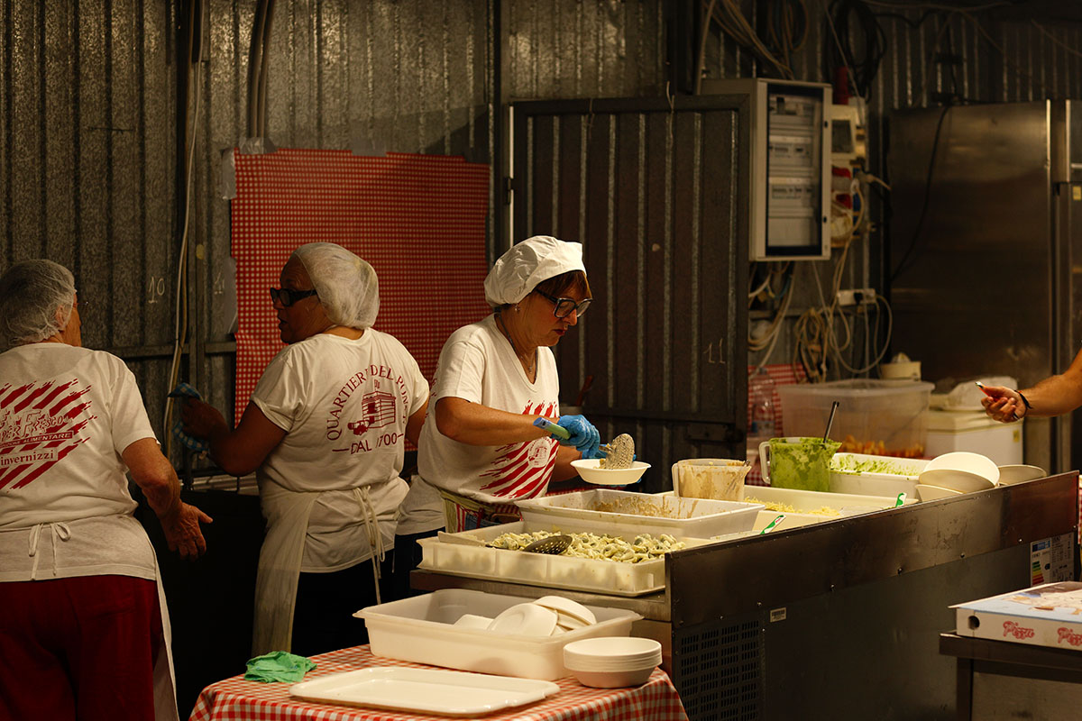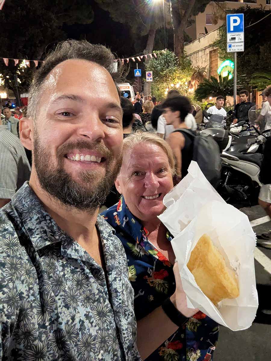 Friday night kicked things off. In our quartiere, Spiaggia, the food and drink stands opened for dinner, and we got in line with a drink while we waited for our food. Honestly, I was impressed right away. This wasn’t your typical festival food, it was really good. We went classic with focaccia di Recco (the one I just explained above) and trofie al pesto. I also couldn’t resist ordering fried anchovies, which were perfect. I had a light beer while the ladies went for white wine and spritz. The night started with a slow trickle of people, but by the time dinner hit its stride, the whole place was alive. The party lasted into the early hours.